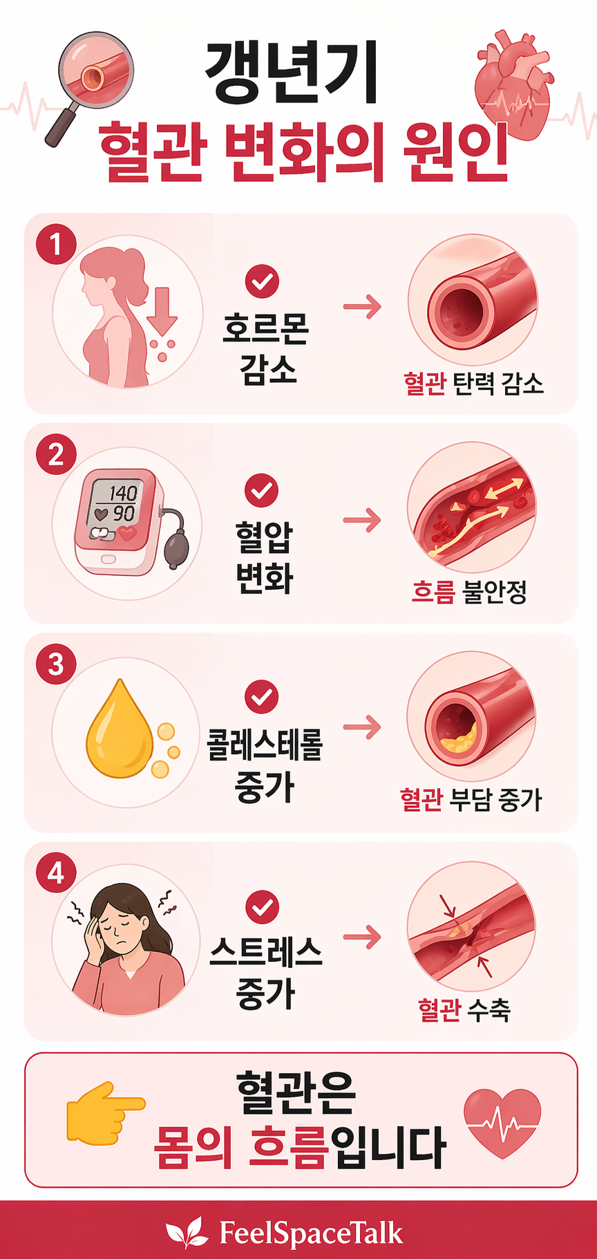 👉 갱년기 혈관 변화는 호르몬 감소와 생활 습관이 함께 작용하면서 진행됩니다.