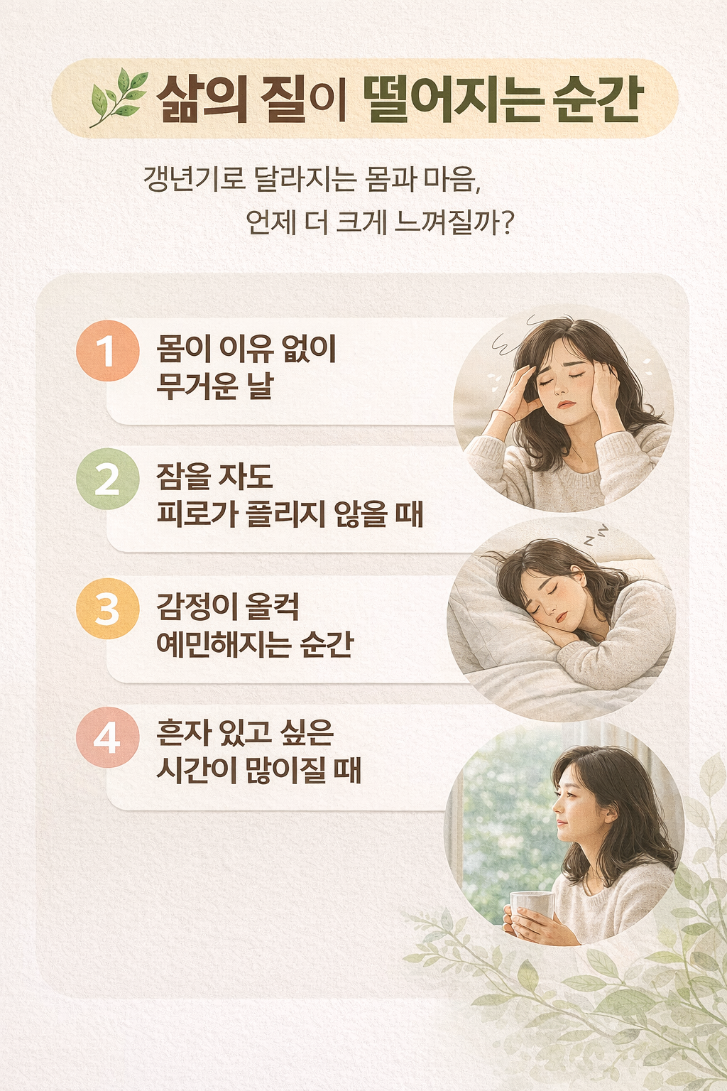 갱년기의 변화는 특정 순간에 더 크게 느껴집니다.