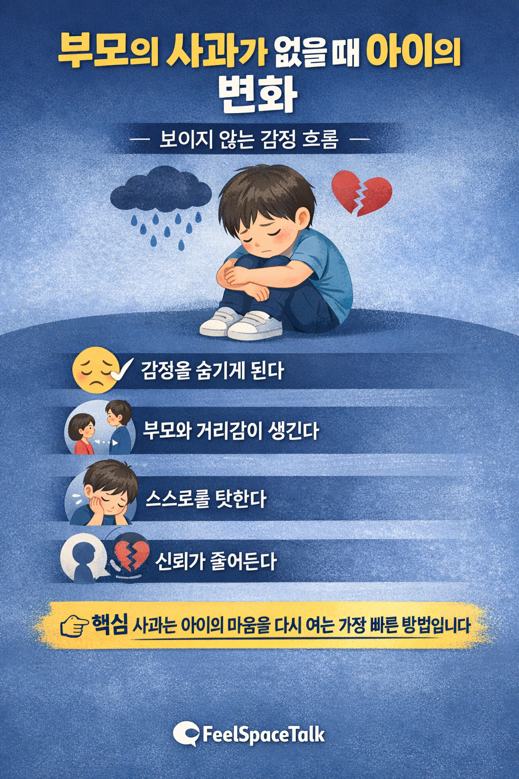 부모의 사과가 없을 때 아이에게 나타나는 감정 변화와 관계 영향을 정리한 심리 인포그래픽