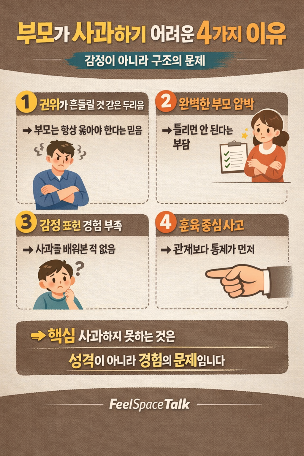 부모가 사과하기 어려운 이유 4가지를 구조적 심리 관점에서 정리한 육아 인포그래픽