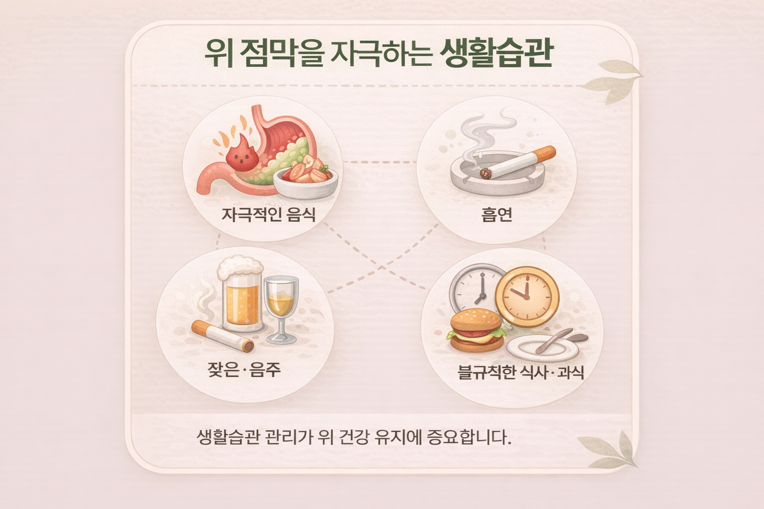 흡연, 음주, 불규칙한 식사 습관 등은 위 점막 환경에 영향을 줄 수 있습니다.