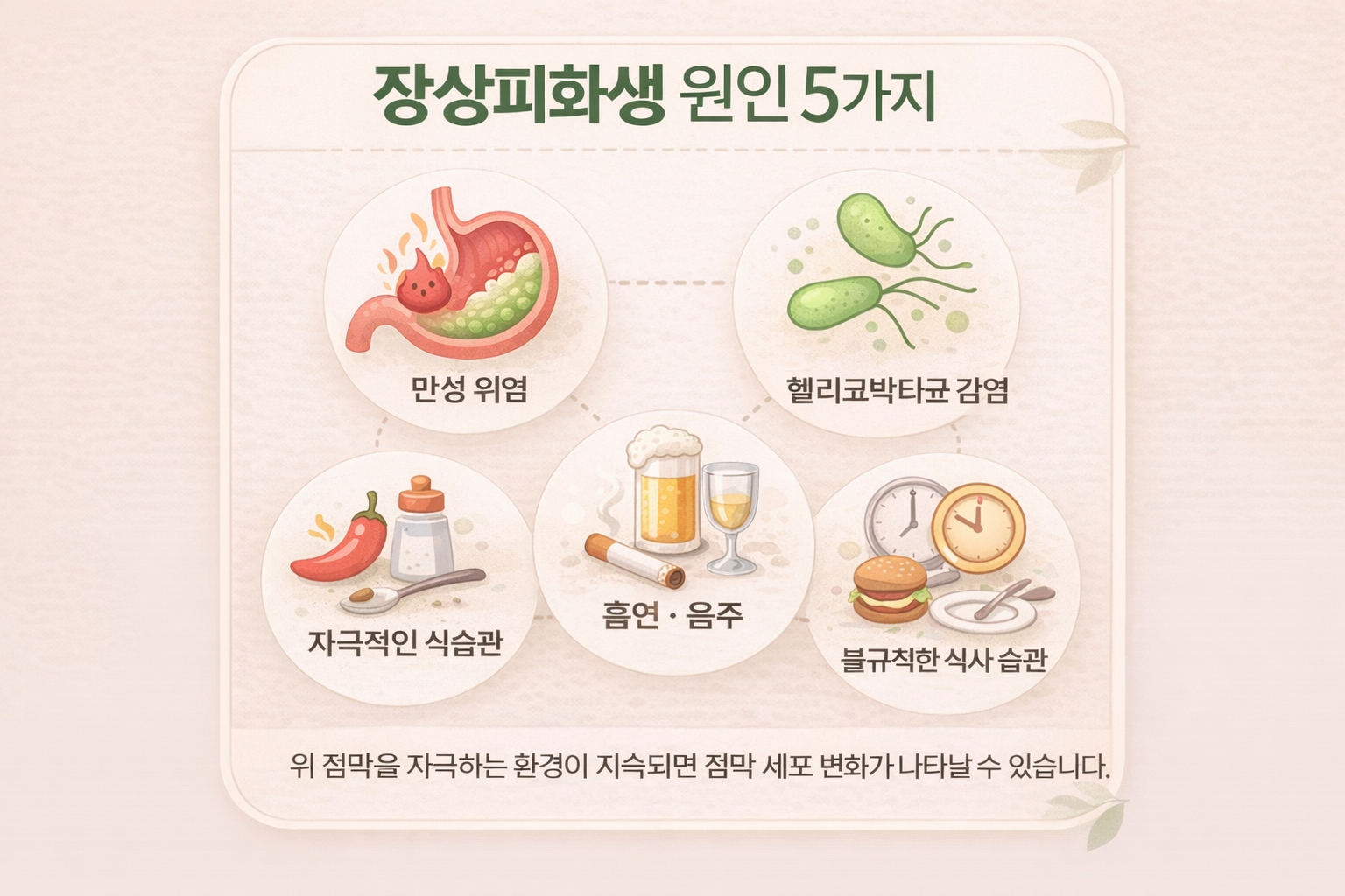 장상피화생은 하나의 원인만으로 발생하기보다 여러 요인이 함께 작용하여 나타날 수 있는 위 점막 변화입니다. 만성 위염, 헬리코박터균 감염, 식습관, 흡연과 음주, 불규칙한 식사 등 다양한 생활 요소가 위 점막 환경에 영향을 줄 수 있습니다.