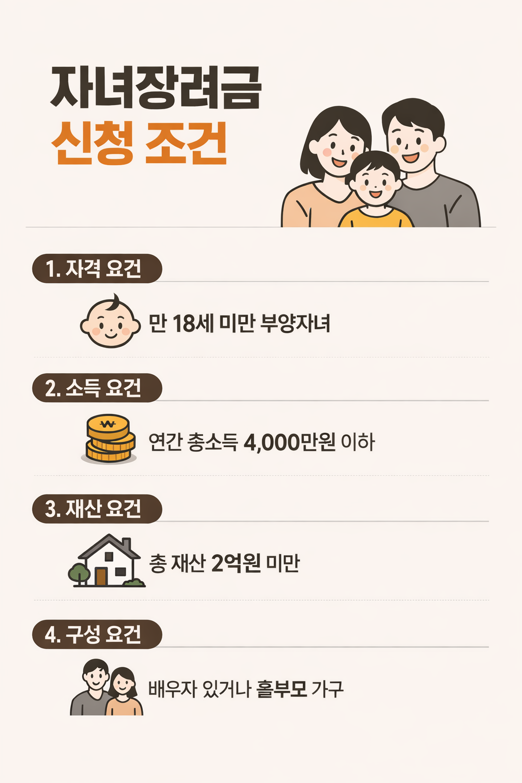 자녀장려금은 아무 가구나 받을 수 있는 것은 아닙니다. 크게 보면 다음 조건을 함께 봅니다.
