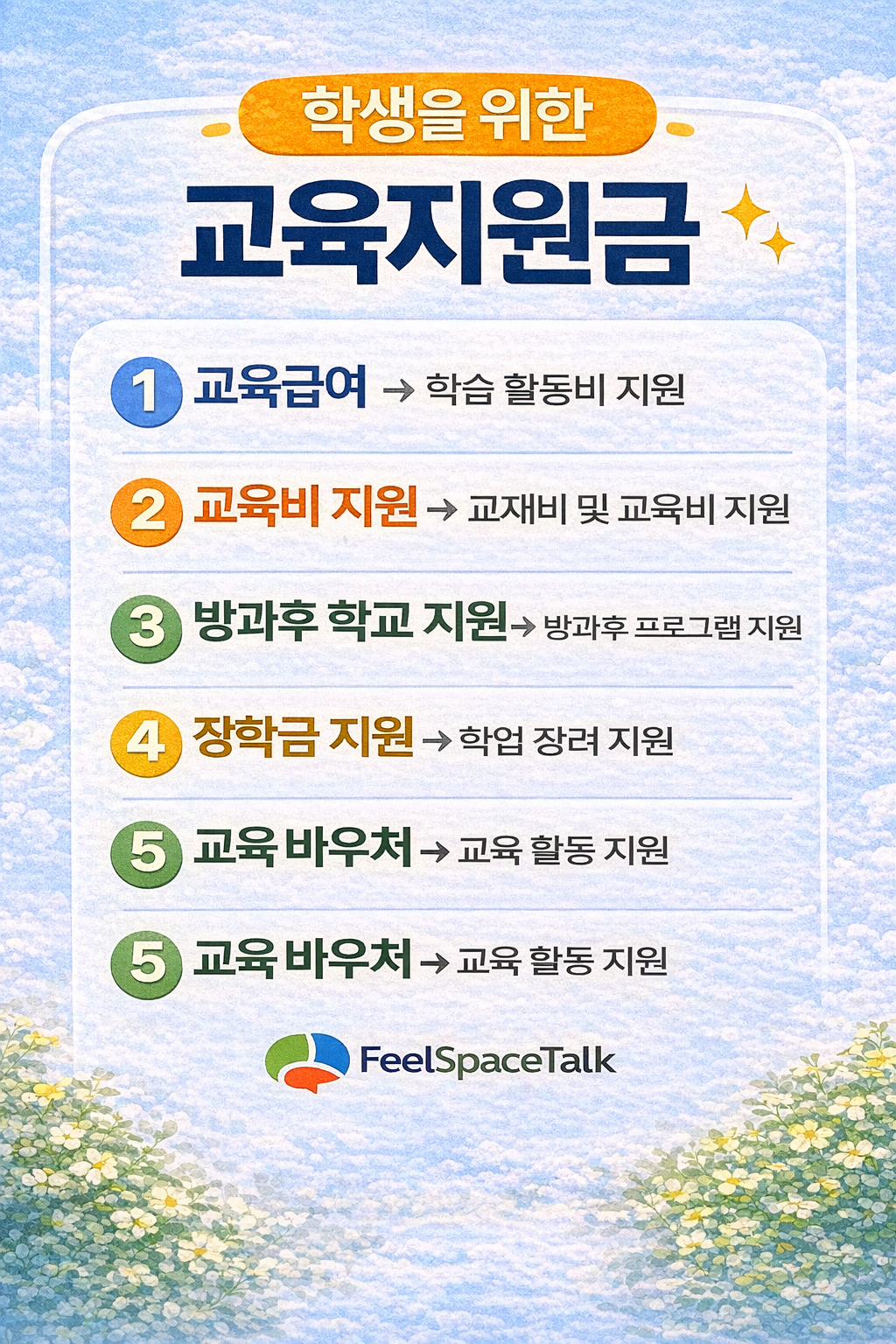 자녀가 성장하면서 가장 크게 느끼는 부담 중 하나가 바로 교육비입니다. 교재비, 학원비, 방과후 활동비, 교통비 등 교육과 관련된 지출은 생각보다 다양하고 꾸준히 발생합니다. 특히 초등학교부터 중학교, 고등학교로 올라갈수록 교육비 부담은 점점 커질 수 있습니다. 그래서 정부에서는 학생과 학부모의 교육비 부담을 줄이기 위해 다양한 교육 지원 정책과 지원금 제도를 운영하고 있습니다.