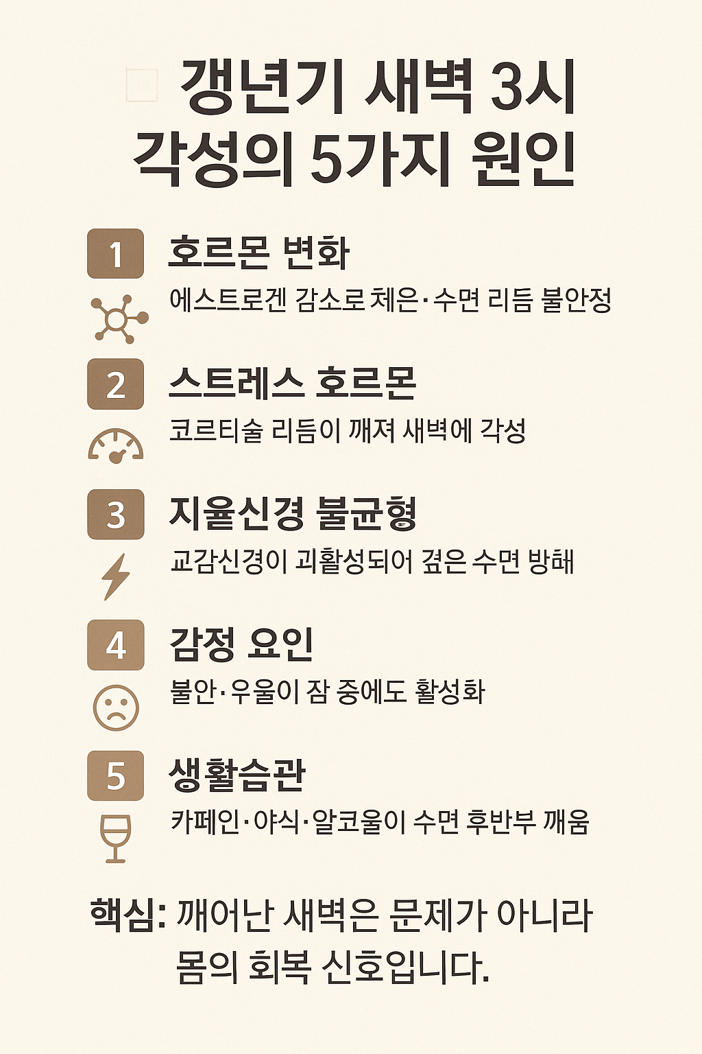 새벽 3시에 깨는 현상은 갱년기의 대표적인 생리적 변화입니다. 하지만 그 안에는 호르몬·자율신경·감정·생활 리듬의 복합적 신호가 담겨 있습니다.