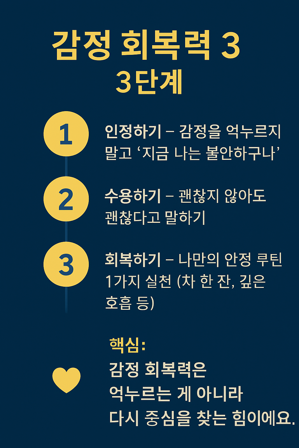 감정 회복력은 ‘마음의 근육’입니다. 단단한 사람은 무너지지 않는 사람이 아니라, 무너져도 다시 일어나는 사람입니다.