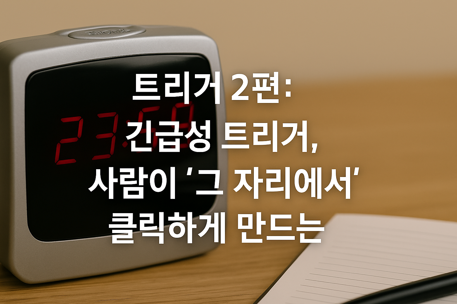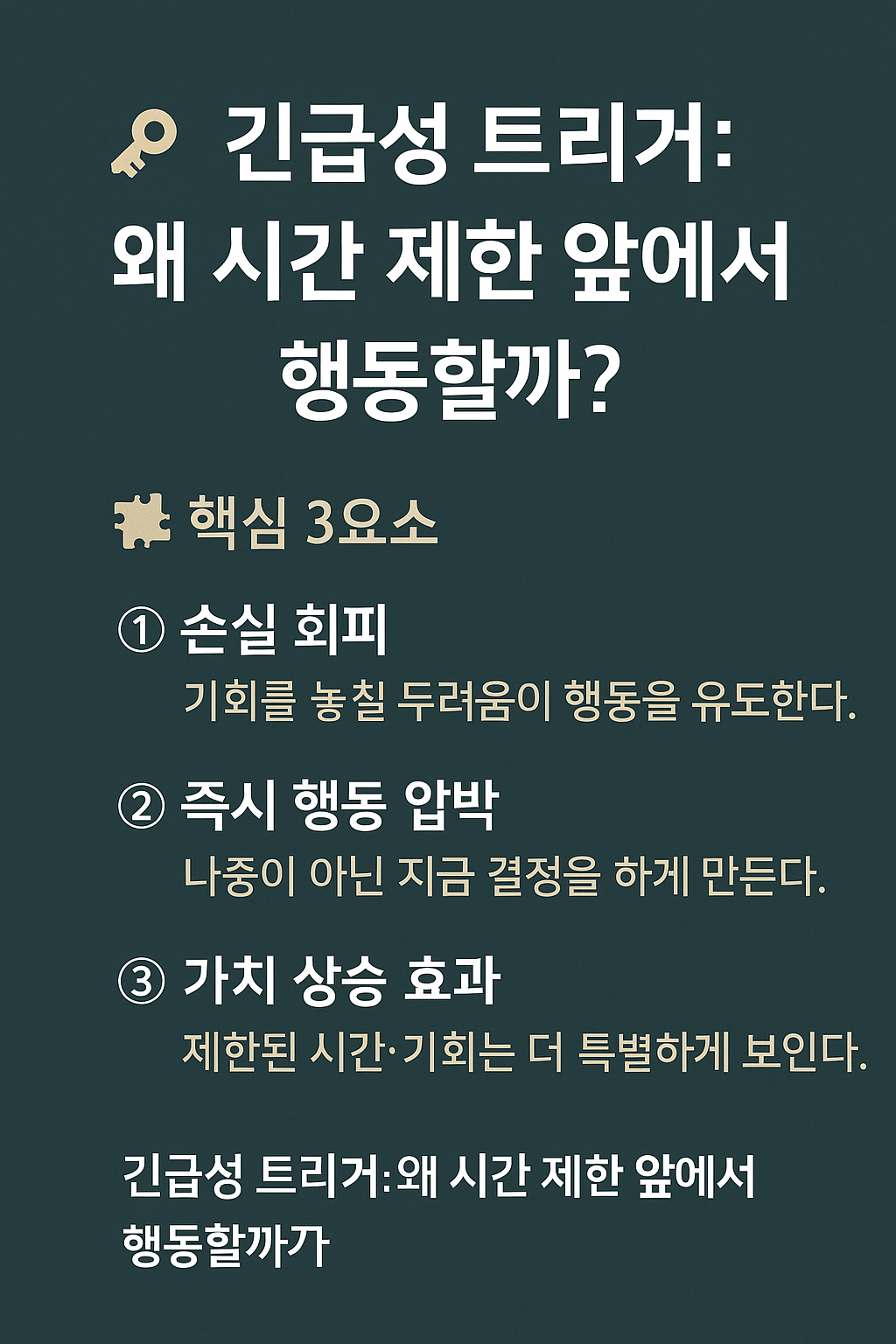 즉, 긴급성은 새로운 욕구를 만드는 것이 아니라, 이미 관심 있는 대상을 즉시 행동으로 연결시켜 주는 심리 버튼입니다.