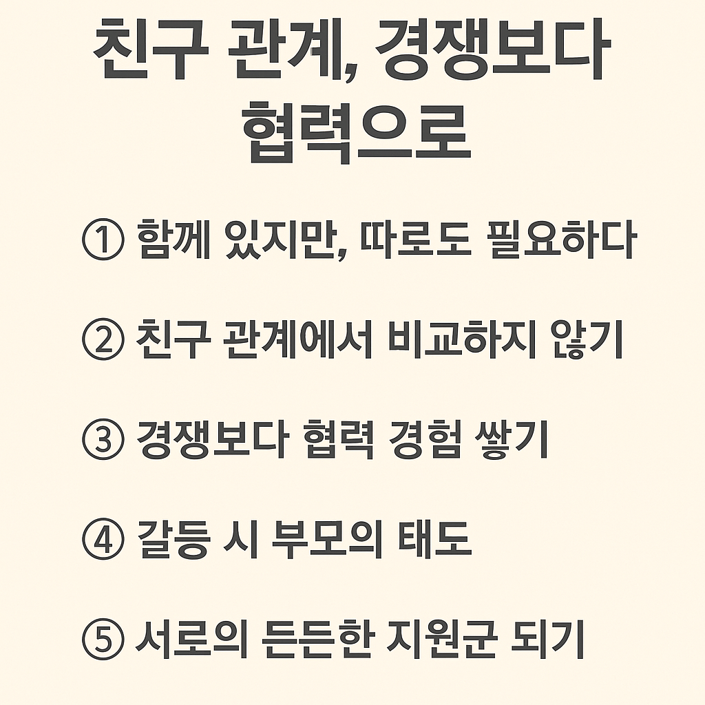 부모는 무심코 “누가 친구가 더 많아?”라고 물을 수 있습니다.  그러나 이런 질문은 곧바로 경쟁의 불씨가 됩니다.  쌍둥이가 서로 다른 친구 그룹을 가졌다면, “네 친구는 어떤 점이 좋아?”, “너는 어떤 활동을 즐겨?”처럼 개별적인 질문을 던지세요.