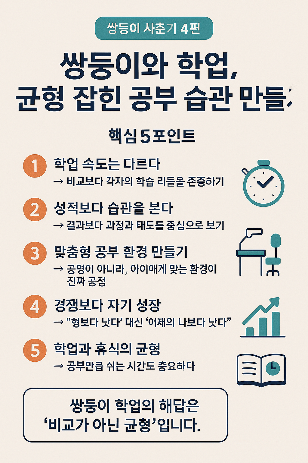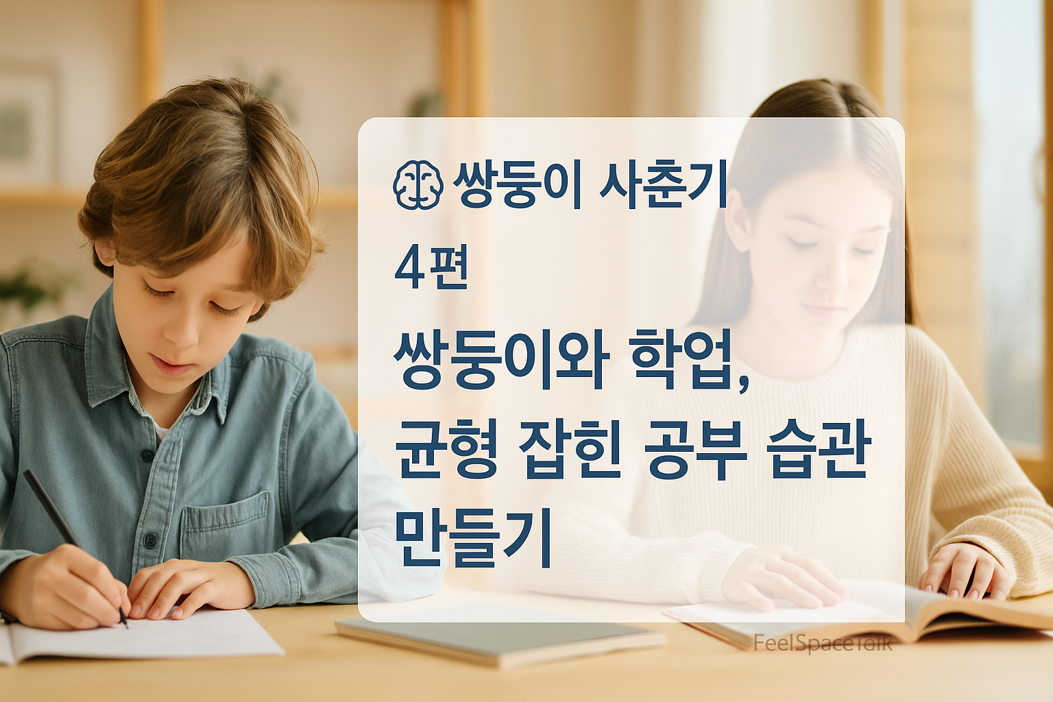 이 글은 《마음 에너지 길잡이: 쌍둥이 & 사춘기 편》의 네 번째 글입니다. 쌍둥이 부모라면 누구나 공감할 학업의 고민, 이제는 경쟁이 아닌 균형으로 풀어가야 합니다.