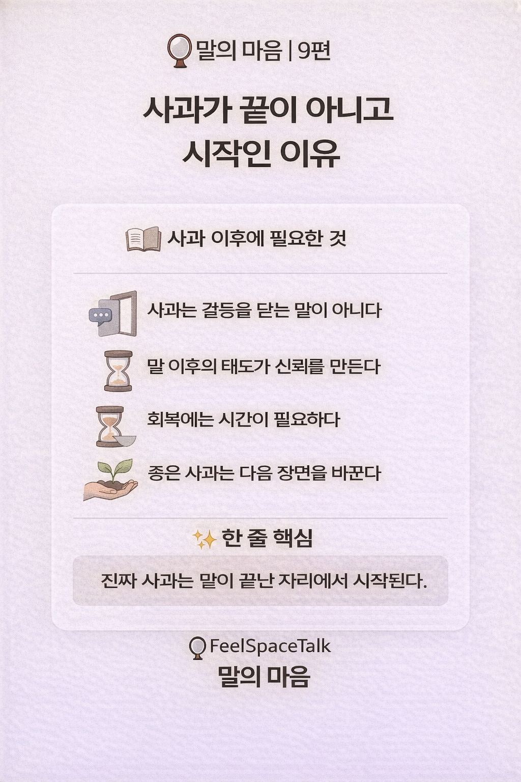 사과의 목적은 용서를 받아내는 것이 아니라, 관계의 다음 장면을 다르게 만드는 데 있습니다. 말투가 달라지고, 선택이 달라지고, 행동이 달라질 때 상대는 비로소 사과를 믿게 됩니다. 사과는 과거를 지우는 말이 아니라, 미래를 다르게 만드는 약속에 가깝습니다.