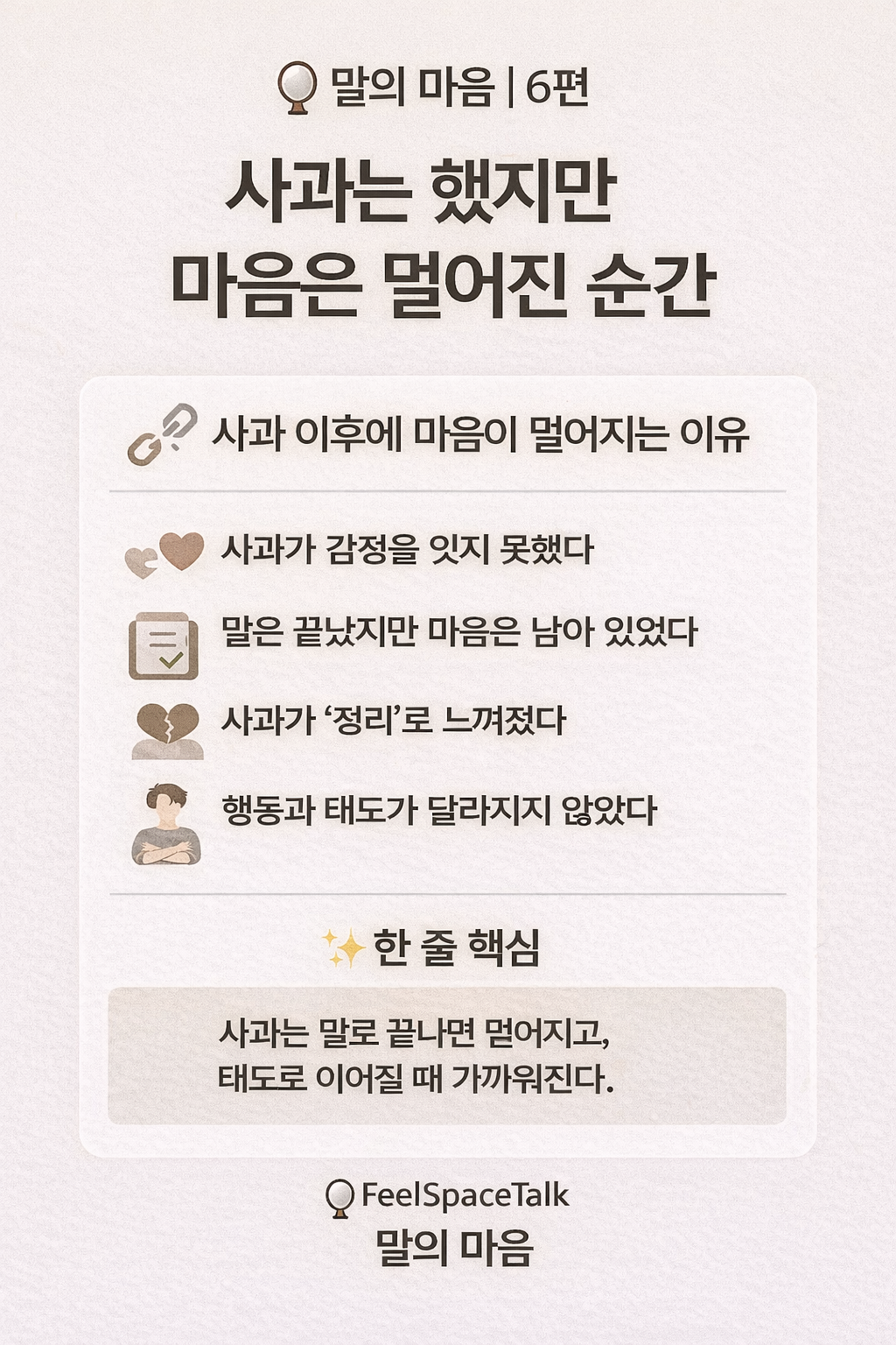 사람의 감정은 말보다 느립니다. 사과가 끝났다고 해서 마음도 동시에 정리되지는 않습니다. 그런데 사과를 한 쪽이 “이제 끝났잖아”라는 태도를 보이면, 감정을 아직 내려놓지 못한 쪽은 더 이상 말할 자리를 잃게 됩니다. 그 순간 관계 안에는 말해지지 않은 감정이 남고, 그 감정은 시간이 지나면서 거리감으로 변합니다.