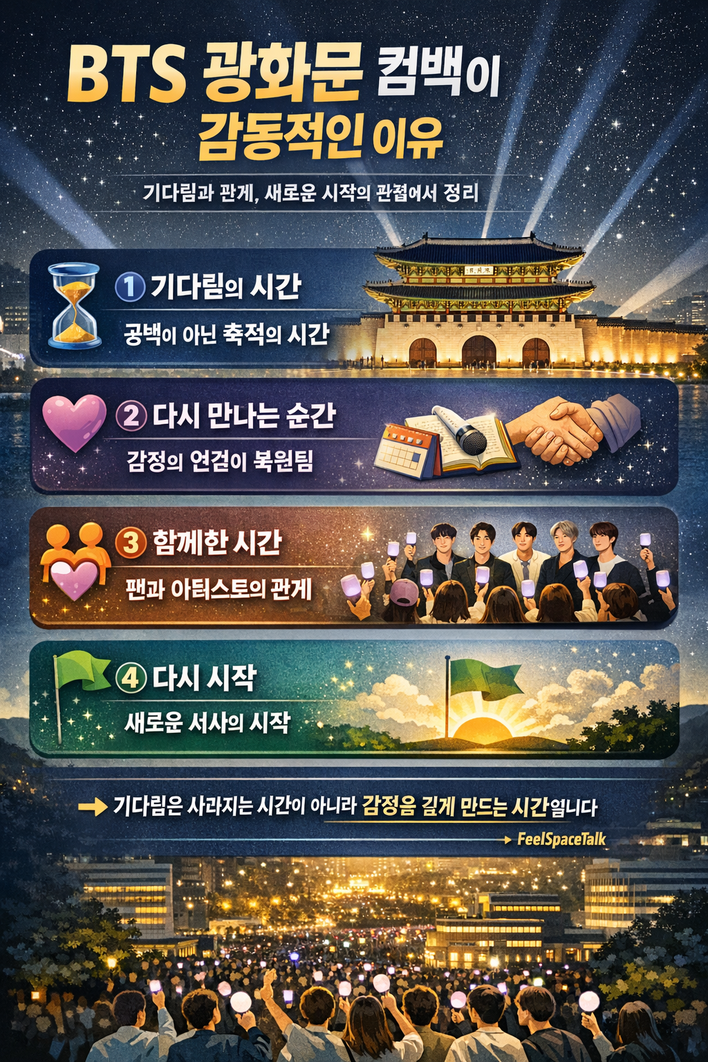 그날의 광화문은 단순한 공연장이 아니었습니다. 사람들은 이미 모여 있었고, 무대가 시작되기 전부터 감정은 조용히 쌓이고 있었습니다. 그리고 마침내, BTS가 다시 한자리에 섰습니다. 그 순간 우리는 단순히 “돌아왔다”는 사실을 본 것이 아니라, “시간이 이어졌다”는 감각을 함께 느끼게 됩니다.