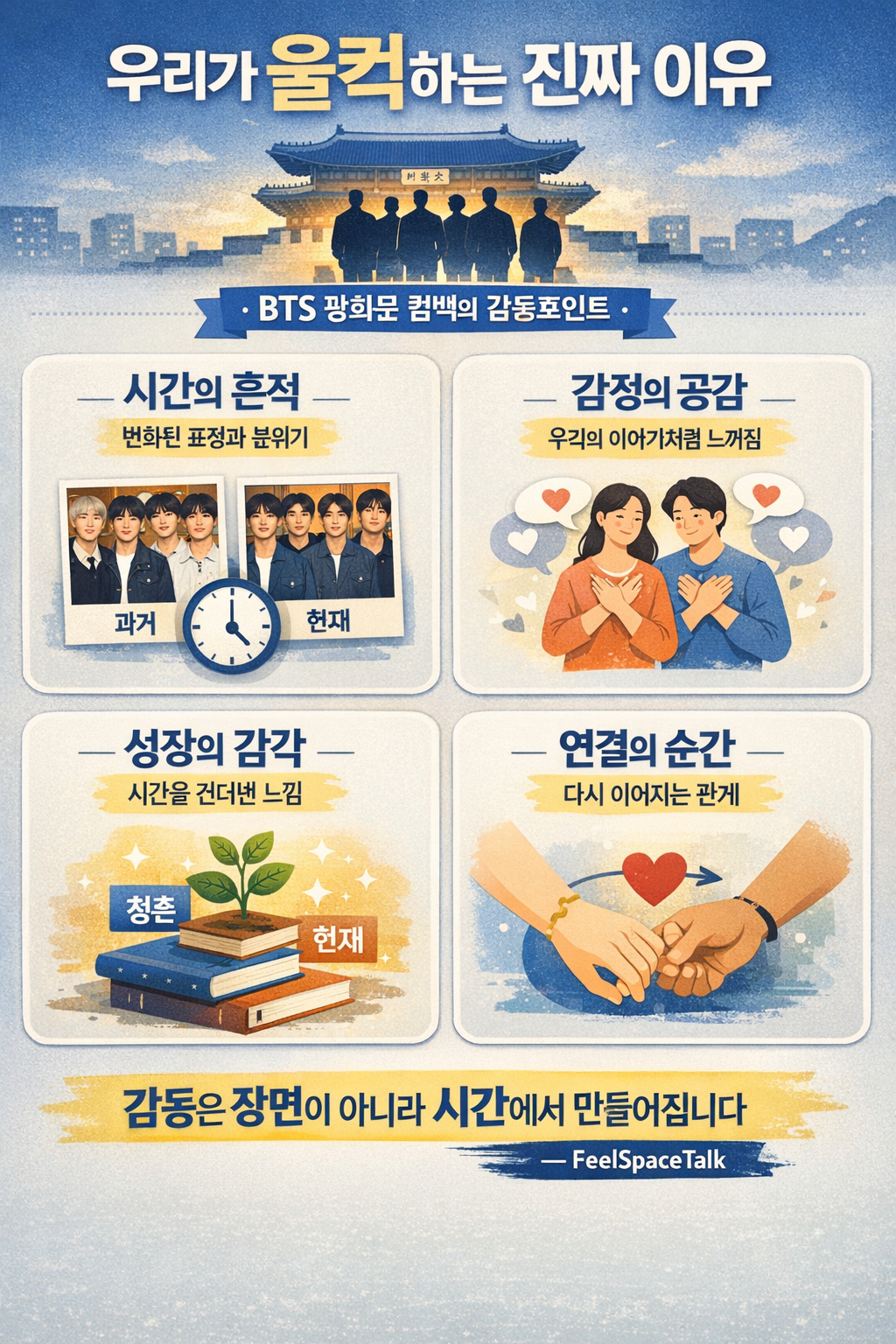 그날 광화문에서 우리가 본 것은 단순한 공연이 아니었습니다. 시간을 견딘 사람들의 이야기였고, 끊어지지 않았던 관계의 증명이었으며, 다시 시작할 수 있다는 가능성이었습니다. 그래서 우리는 감동했고, 그래서 우리는 울컥했습니다.