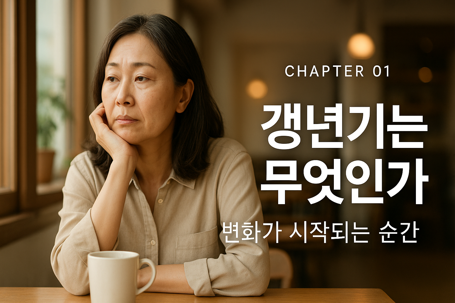 “창가에 앉아 생각에 잠긴 중년 여성의 모습을 담은 갱년기 심리 가이드 챕터 썸네일 이미지”