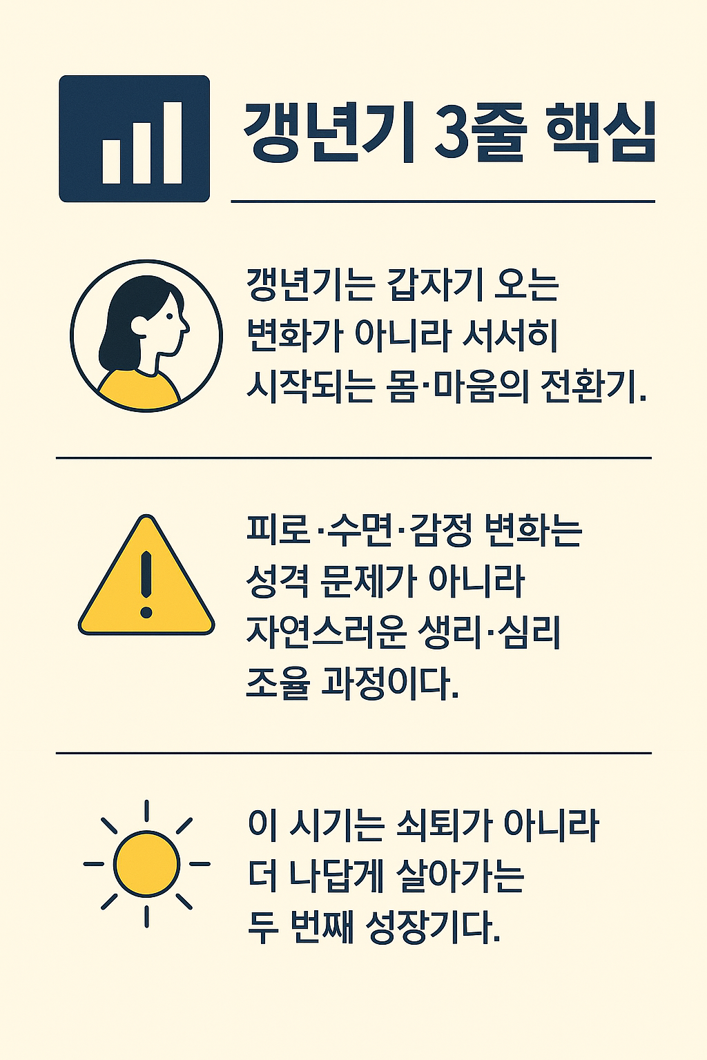 갱년기는 어느 날 갑자기 찾아오는 변화처럼 느껴지지만, 사실은 아주 천천히 시작됩니다.  평소와 다르게 피곤해지고, 잠이 어렵고, 이유 없이 감정이 흔들리는 날이 늘어날 때, 우리는 비로소 “아… 시작이구나” 하고 깨닫게 됩니다.